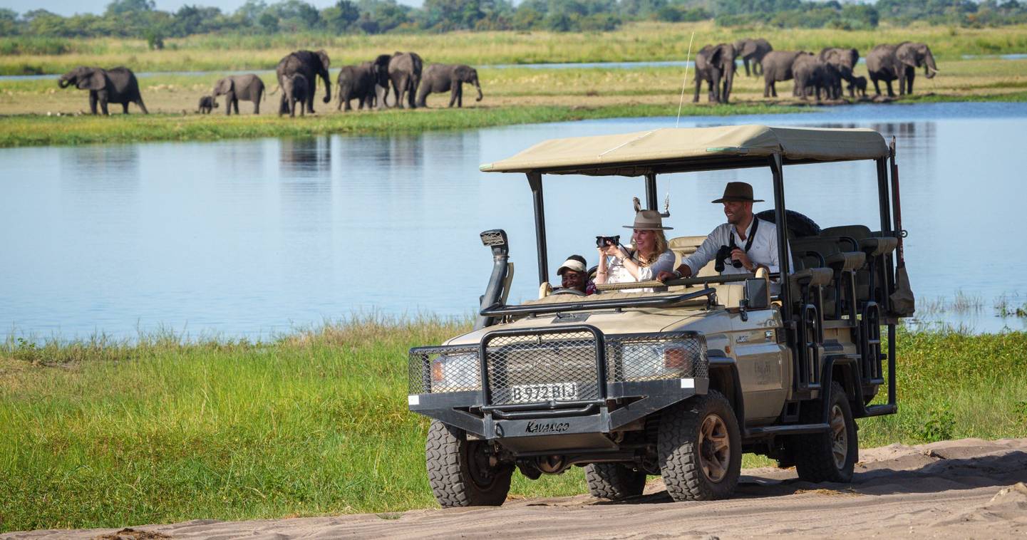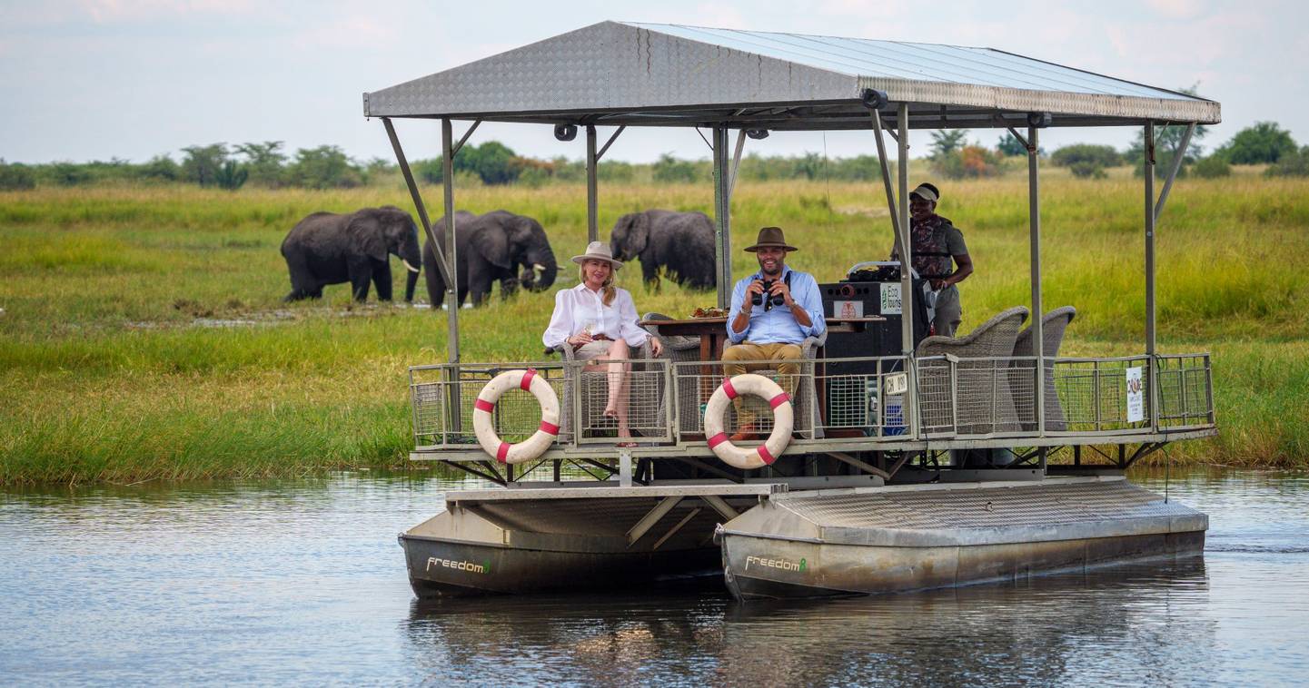 The landscape below transforms as your light aircraft climbs out of the Delta’s green labyrinth and tracks north-east toward the Chobe River — papyrus and palm islands giving way to dry woodland, then the broad, sun-baked floodplain. You’ll be met at Kasane Airport and transferred to Chobe Game Lodge — the only permanent lodge inside Chobe National Park and Botswana’s original five-star safari property, established in 1972. Settle into your river-facing room with its complimentary minibar and private terrace, then head out on a late afternoon river cruise aboard one of the lodge’s solar-powered electric safari boats. The silent approach allows remarkably close encounters with vast elephant herds, hippo pods, Nile crocodile and a kaleidoscope of waterbirds. Return to the lodge for dinner on the riverfront boardwalk as the sun sets over the floodplain.