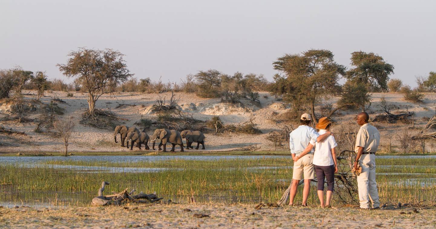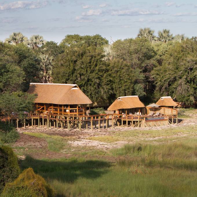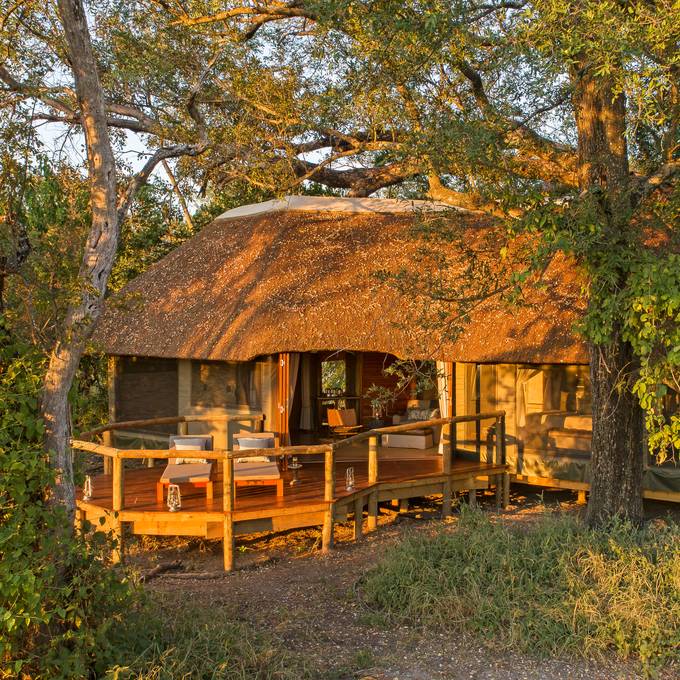 The shift is immediate. Where Makgadikgadi was open and dry, the view from your aircraft window now fills with serpentine channels, palm-fringed islands and the unmistakable green of the Okavango Delta system. You land near the Moremi Game Reserve and transfer to a classic tented camp on the banks of the Khwai River, overlooking Xakanaxa Lagoon. This is one of Botswana’s oldest and most characterful safari camps — Meru-style canvas tents under towering trees, a self-service bar, and paraffin lamps that light the walkways after dark. Settle in, then head out on an afternoon game drive through mopane woodland and open savannah. The habitat here is richer and more layered than the pans — lion, leopard, elephant, buffalo and wild dog all frequent this area.