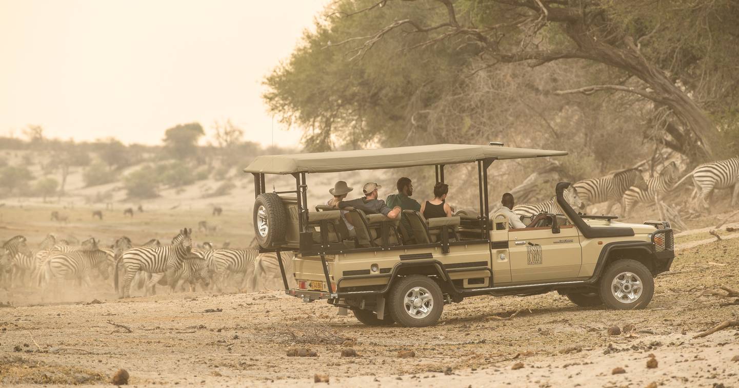 The scrubland below your light aircraft gives way to dry riverbed and open grassland as you track south-east from Maun towards the Makgadikgadi Pans. A short transfer from the airstrip brings you to a lodge perched on cliffs ten metres above the Boteti River — the name translates as ‘lion’s paw’ in Setswana, and the elevated position delivers sweeping, east-facing views across the river to the national park beyond. After settling in over lunch, head out on an afternoon game drive into Makgadikgadi Pans National Park. In the dry months, zebra and wildebeest gather along the Boteti in large numbers, shadowed by lion, hyena and cheetah. Return to the lodge for dinner as the sun sets behind you and the first stars appear over the pans.