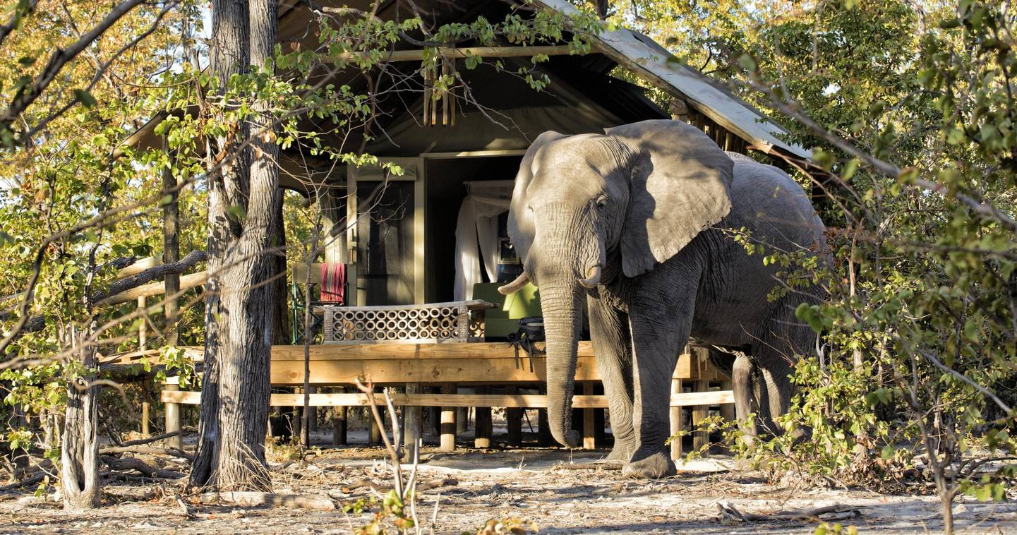 From the air, the landscape tells the whole story of this itinerary: the dry Kalahari edge gives way to mopane woodland, then channels and floodplains stretching to the horizon. A morning drive returns you to Maun, and from there a light aircraft carries you north into the Khwai Private Reserve. Elephant Pan sits among cathedral mopane trees, overlooking a permanent waterhole where the action never stops. This is a different world from the pans — thicker bush, staggering elephant numbers, and a pace that feels wonderfully unhurried. By afternoon, you could be watching from the ground-level photographic hide as a breeding herd drinks just metres away.