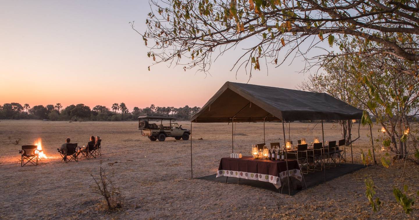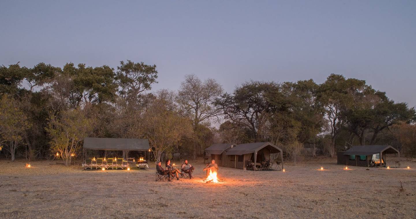 Evenings in camp are a large part of what people remember. Dinner is served under the stars at a laid table, cooked from scratch by a safari chef who travels with the group. Afterwards the fire stays lit, the guide stays up, and the conversation tends to run long. The sounds outside the canvas — lions calling across the marsh, hyena on the move, the odd snap of a branch nearby — are not a backdrop. They are the point.