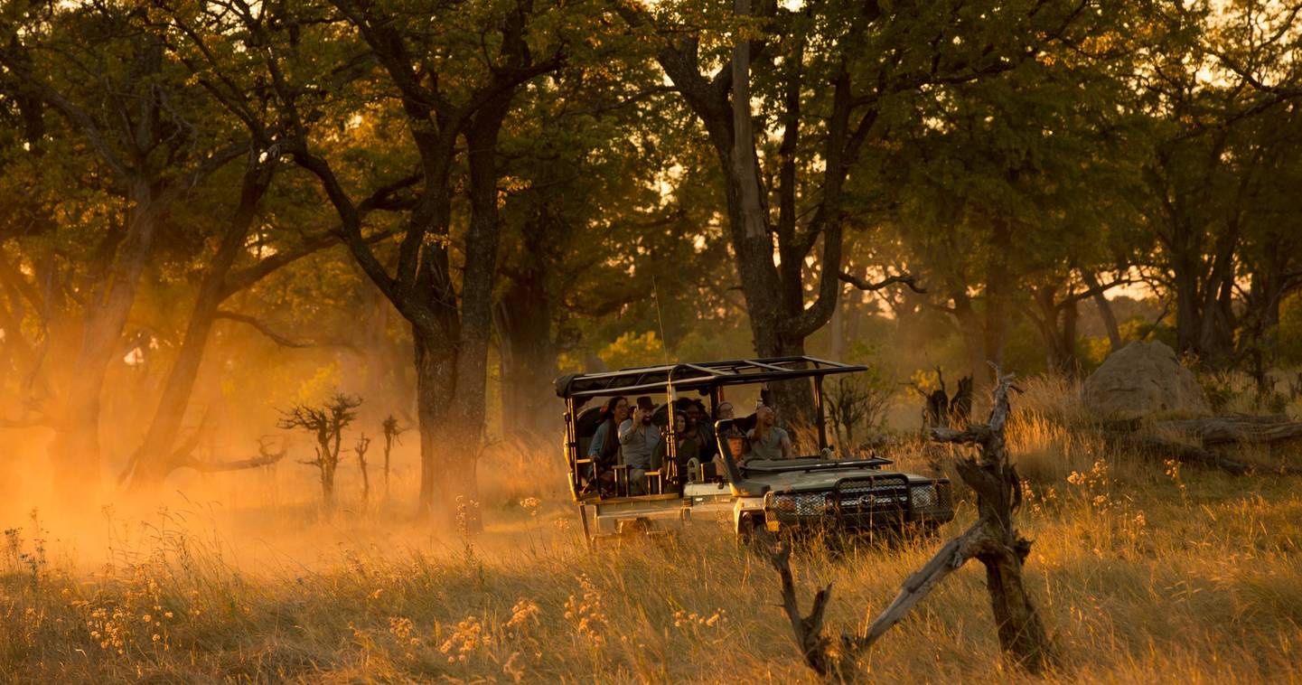 The daily rhythm in Mababe follows the same pattern as Moremi — dawn drive, midmorning brunch, afternoon drive — but with two additions that change the texture of the experience. Walking safaris go out on foot conditions permitting, the guide reading grass height and safety on the day; there is a different quality of attention when moving on the ground. And after the afternoon drive, the vehicles do not return to camp when the light fails. Night drives run here by spotlight, into ground that national park regulations put out of reach elsewhere on the route. The bush in Mababe after dark is its own thing entirely.